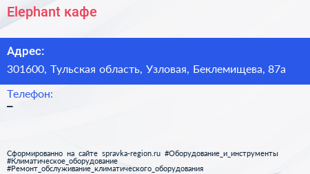 Elephant, кафе по адресу 301600, Тульская область, Узловая, Беклемищева, 87а в дальнейшем Организация, размещена в следующих категориях: