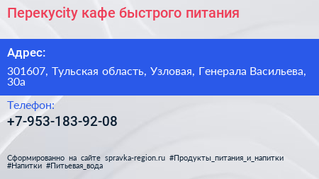 Перекуcity, кафе быстрого питания по адресу 301607, Тульская область, Узловая, Генерала Васильева, 30а в дальнейшем Организация, размещена в следующих категориях: