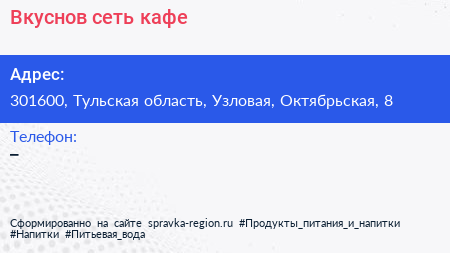 Вкуснов, сеть кафе по адресу 301600, Тульская область, Узловая, Октябрьская, 8 в дальнейшем Организация, размещена в следующих категориях: