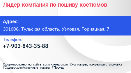 Лидер, компания по пошиву костюмов по адресу 301608, Тульская область, Узловая, Горняцкая, 7 в дальнейшем Организация, размещена в следующих категориях: