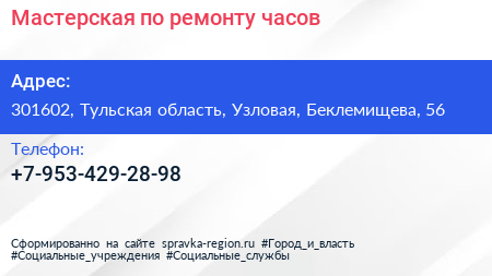 Мастерская по ремонту часов по адресу 301602, Тульская область, Узловая, Беклемищева, 56 в дальнейшем Организация, размещена в следующих категориях: