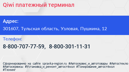 Qiwi, платежный терминал по адресу 301607, Тульская область, Узловая, Пушкина, 12 в дальнейшем Организация, размещена в следующих категориях:
