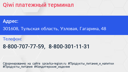 Qiwi, платежный терминал по адресу 301608, Тульская область, Узловая, Гагарина, 48 в дальнейшем Организация, размещена в следующих категориях: