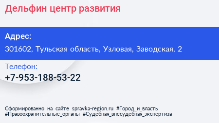 Дельфин, центр развития по адресу 301602, Тульская область, Узловая, Заводская, 2 в дальнейшем Организация, размещена в следующих категориях: