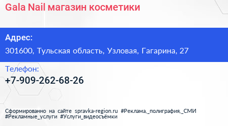 Gala Nail, магазин косметики по адресу 301600, Тульская область, Узловая, Гагарина, 27 в дальнейшем Организация, размещена в следующих категориях: