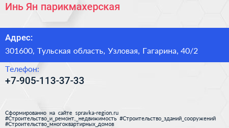 Инь-Ян, парикмахерская по адресу 301600, Тульская область, Узловая, Гагарина, 40/2 в дальнейшем Организация, размещена в следующих категориях: