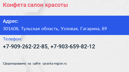 Конфета, салон красоты по адресу 301608, Тульская область, Узловая, Гагарина, 89 в дальнейшем Организация, размещена в следующих категориях:
