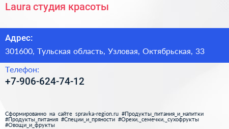 Laura, студия красоты по адресу 301600, Тульская область, Узловая, Октябрьская, 33 в дальнейшем Организация, размещена в следующих категориях:
