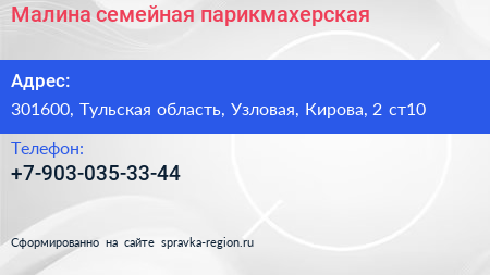 Малина, семейная парикмахерская по адресу 301600, Тульская область, Узловая, Кирова, 2 ст10 в дальнейшем Организация, размещена в следующих категориях:
