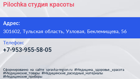 Pilochka, студия красоты по адресу 301602, Тульская область, Узловая, Беклемищева, 56 в дальнейшем Организация, размещена в следующих категориях: