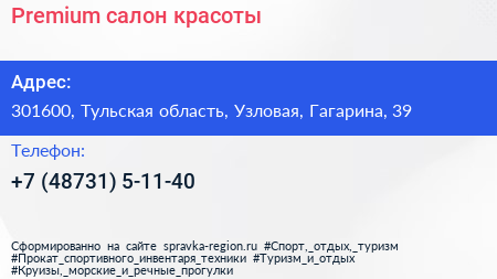 Premium, салон красоты по адресу 301600, Тульская область, Узловая, Гагарина, 39 в дальнейшем Организация, размещена в следующих категориях: