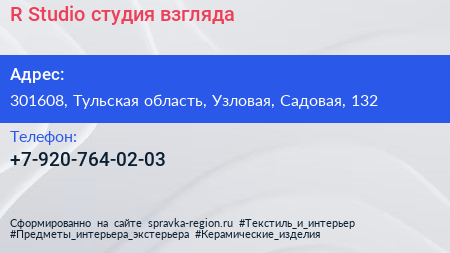 R-Studio, студия взгляда по адресу 301608, Тульская область, Узловая, Садовая, 132 в дальнейшем Организация, размещена в следующих категориях: