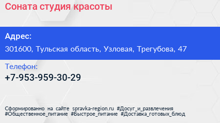 Соната, студия красоты по адресу 301600, Тульская область, Узловая, Трегубова, 47 в дальнейшем Организация, размещена в следующих категориях: