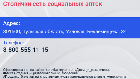 Столички, сеть социальных аптек по адресу 301600, Тульская область, Узловая, Беклемищева, 34 в дальнейшем Организация, размещена в следующих категориях: