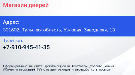 Магазин дверей по адресу 301602, Тульская область, Узловая, Заводская, 13 в дальнейшем Организация, размещена в следующих категориях: