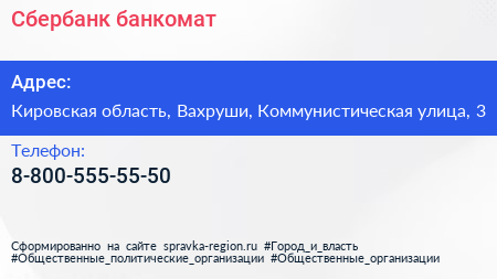 Сбербанк, банкомат по адресу Кировская область, Вахруши, Коммунистическая улица, 3 в дальнейшем Организация, размещена в следующих категориях: