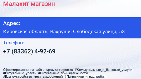 Малахит, магазин по адресу Кировская область, Вахруши, Слободская улица, 53 в дальнейшем Организация, размещена в следующих категориях: