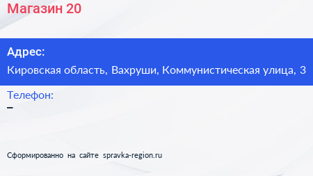 Магазин №20 по адресу Кировская область, Вахруши, Коммунистическая улица, 3 в дальнейшем Организация, размещена в следующих категориях: