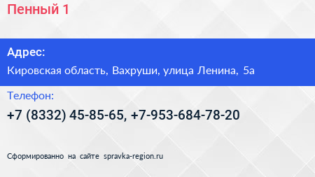Пенный №1 по адресу Кировская область, Вахруши, улица Ленина, 5а в дальнейшем Организация, размещена в следующих категориях: