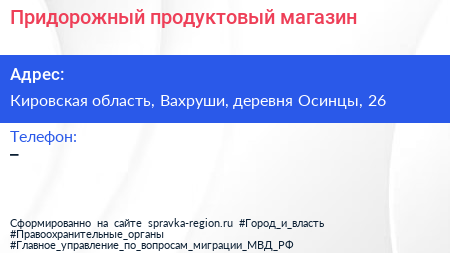 Придорожный, продуктовый магазин по адресу Кировская область, Вахруши, деревня Осинцы, 26 в дальнейшем Организация, размещена в следующих категориях: