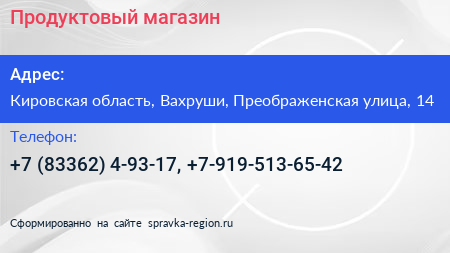 Продуктовый магазин по адресу Кировская область, Вахруши, Преображенская улица, 14 в дальнейшем Организация, размещена в следующих категориях: