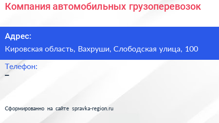 Компания автомобильных грузоперевозок по адресу Кировская область, Вахруши, Слободская улица, 100 в дальнейшем Организация, размещена в следующих категориях: