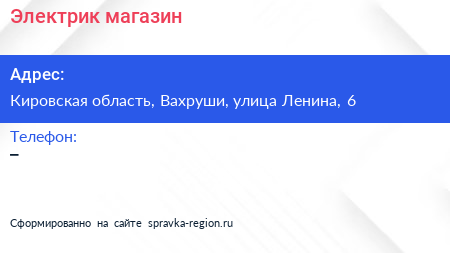 Электрик, магазин по адресу Кировская область, Вахруши, улица Ленина, 6 в дальнейшем Организация, размещена в следующих категориях: