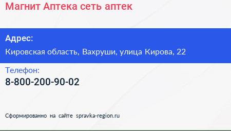 Магнит Аптека, сеть аптек по адресу Кировская область, Вахруши, улица Кирова, 22 в дальнейшем Организация, размещена в следующих категориях: