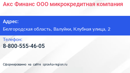 Акс Финанс, ООО, микрокредитная компания по адресу Белгородская область, Валуйки, Клубная улица, 2 в дальнейшем Организация, размещена в следующих категориях:
