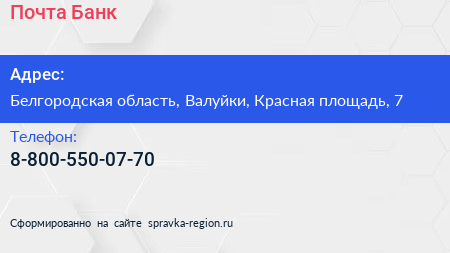 Почта Банк по адресу Белгородская область, Валуйки, Красная площадь, 7 в дальнейшем Организация, размещена в следующих категориях: