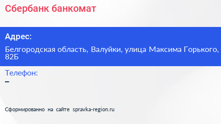 Сбербанк, банкомат по адресу Белгородская область, Валуйки, улица Максима Горького, 82Б в дальнейшем Организация, размещена в следующих категориях: