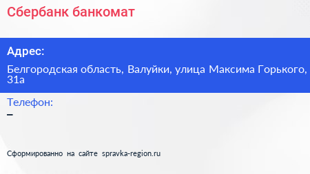 Сбербанк, банкомат по адресу Белгородская область, Валуйки, улица Максима Горького, 31а в дальнейшем Организация, размещена в следующих категориях: