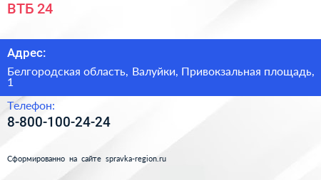 ВТБ 24 по адресу Белгородская область, Валуйки, Привокзальная площадь, 1 в дальнейшем Организация, размещена в следующих категориях: