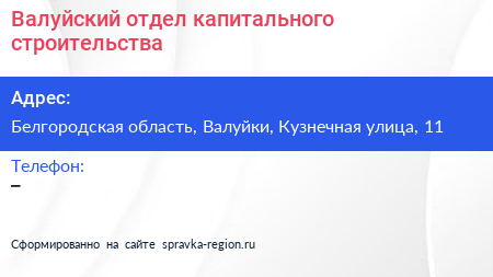 Валуйский отдел капитального строительства по адресу Белгородская область, Валуйки, Кузнечная улица, 11 в дальнейшем Организация, размещена в следующих категориях: