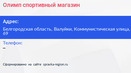 Олимп, спортивный магазин по адресу Белгородская область, Валуйки, Коммунистическая улица, 69 в дальнейшем Организация, размещена в следующих категориях: