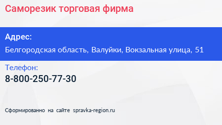 Саморезик, торговая фирма по адресу Белгородская область, Валуйки, Вокзальная улица, 51 в дальнейшем Организация, размещена в следующих категориях:
