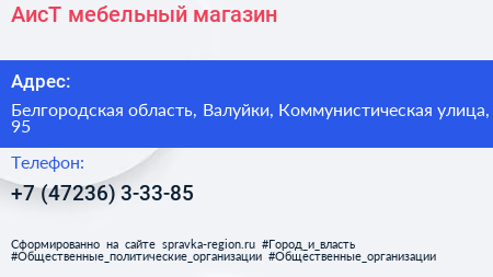 АисТ, мебельный магазин по адресу Белгородская область, Валуйки, Коммунистическая улица, 95 в дальнейшем Организация, размещена в следующих категориях: