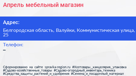 Апрель, мебельный магазин по адресу Белгородская область, Валуйки, Коммунистическая улица, 25 в дальнейшем Организация, размещена в следующих категориях: