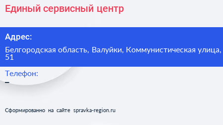 Единый, сервисный центр по адресу Белгородская область, Валуйки, Коммунистическая улица, 51 в дальнейшем Организация, размещена в следующих категориях: