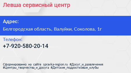 Левша, сервисный центр по адресу Белгородская область, Валуйки, Соколова, 1г в дальнейшем Организация, размещена в следующих категориях: