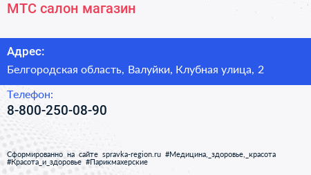 МТС, салон-магазин по адресу Белгородская область, Валуйки, Клубная улица, 2 в дальнейшем Организация, размещена в следующих категориях: