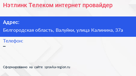 Нэтлинк-Телеком, интернет-провайдер по адресу Белгородская область, Валуйки, улица Калинина, 37а в дальнейшем Организация, размещена в следующих категориях: