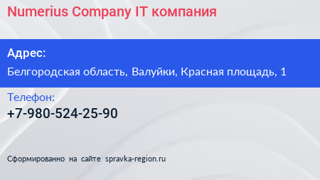 Numerius Company, IT-компания по адресу Белгородская область, Валуйки, Красная площадь, 1 в дальнейшем Организация, размещена в следующих категориях: