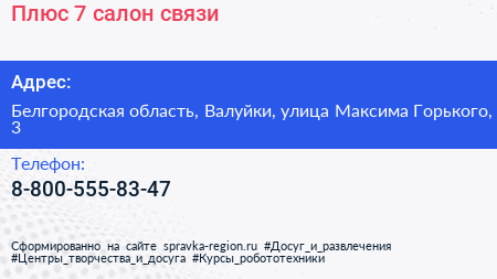 Плюс 7, салон связи по адресу Белгородская область, Валуйки, улица Максима Горького, 3 в дальнейшем Организация, размещена в следующих категориях: