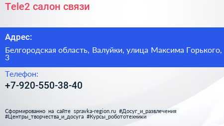Tele2, салон связи по адресу Белгородская область, Валуйки, улица Максима Горького, 3 в дальнейшем Организация, размещена в следующих категориях: