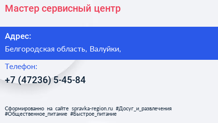 Мастер, сервисный центр по адресу Белгородская область, Валуйки, в дальнейшем Организация, размещена в следующих категориях: