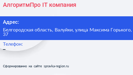 АлгоритмПро, IT-компания по адресу Белгородская область, Валуйки, улица Максима Горького, 37 в дальнейшем Организация, размещена в следующих категориях: