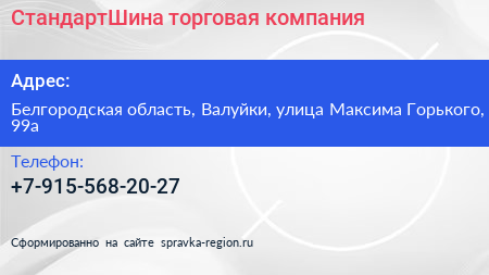 СтандартШина, торговая компания по адресу Белгородская область, Валуйки, улица Максима Горького, 99а в дальнейшем Организация, размещена в следующих категориях: