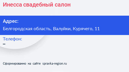 Инесса, свадебный салон по адресу Белгородская область, Валуйки, Курячего, 11 в дальнейшем Организация, размещена в следующих категориях: