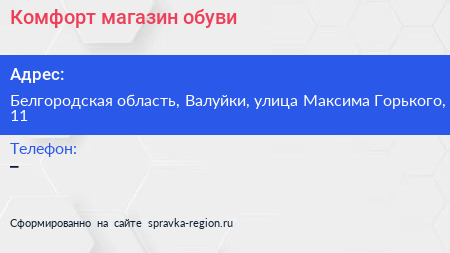 Комфорт, магазин обуви по адресу Белгородская область, Валуйки, улица Максима Горького, 11 в дальнейшем Организация, размещена в следующих категориях: